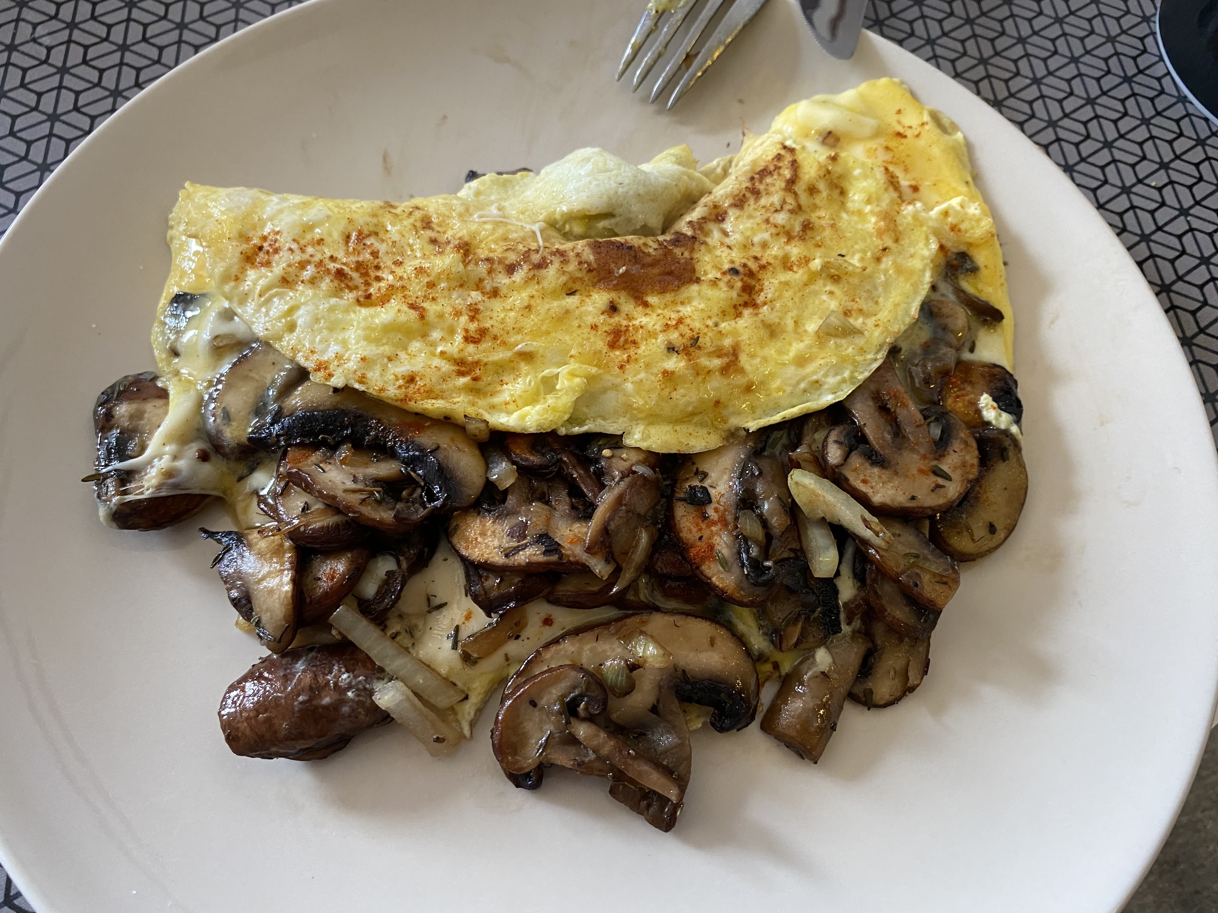 Leckeres Omelette mit gebratenen Champignons und Zwiebeln, das für ein Kohlenhydrat-armes Essen auch so sehr satt macht.
